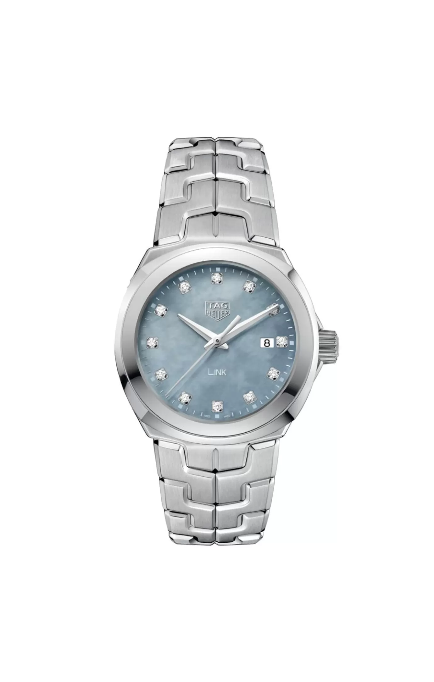 A 32Mm Stainless-Steel, Quartz-Powered Watch With 12 Glittering Diamond (0.116 Ct) Indexes On Its Luminous Blue Mother-Of-Pearl Dial. Rhodium-Plating On The Hands And A Silver Polished Tag Heuer Shield Add Extra Luxury Luster.